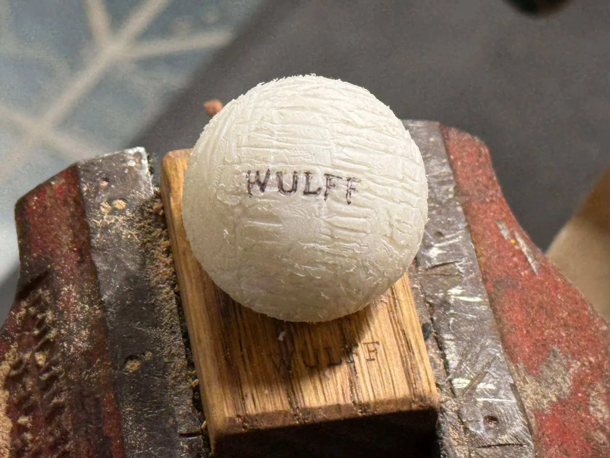 The WULFF Peach Pit is made from a thermoplastic bead that’s very close to the specific gravity of the synthetic gutta percha used to make the McIntyre Park. I’ve found the sweetspot weight for the Peach Pit to be about 38.5 grams or 24 dwt (pennyweight), which makes just a bit heavier than the Park but also a bit smaller in diameter due to the denser nature of the thermoplastic compared to synthetic gutta percha. I’ve tested prior generations of the Peach Pit that matched the diameter of the Park while also equalling the weight of original gutta percha balls (around 44 grams), but found those heavier balls to be damaging to the face of long-nose clubs and hickory shafts. Shaving the weight back to 38.5 grams allows the Peach Pit to play like a Park ball and I haven’t noticed any damage to my club faces or shafts.